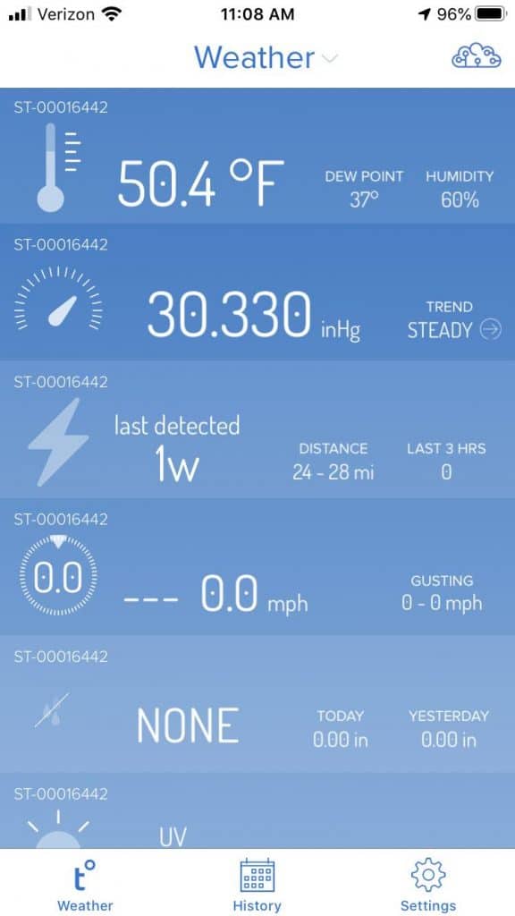 Here is what the Tempest Weather app looks like with the device readings. You can also track the history and it also displays the local area forecast.